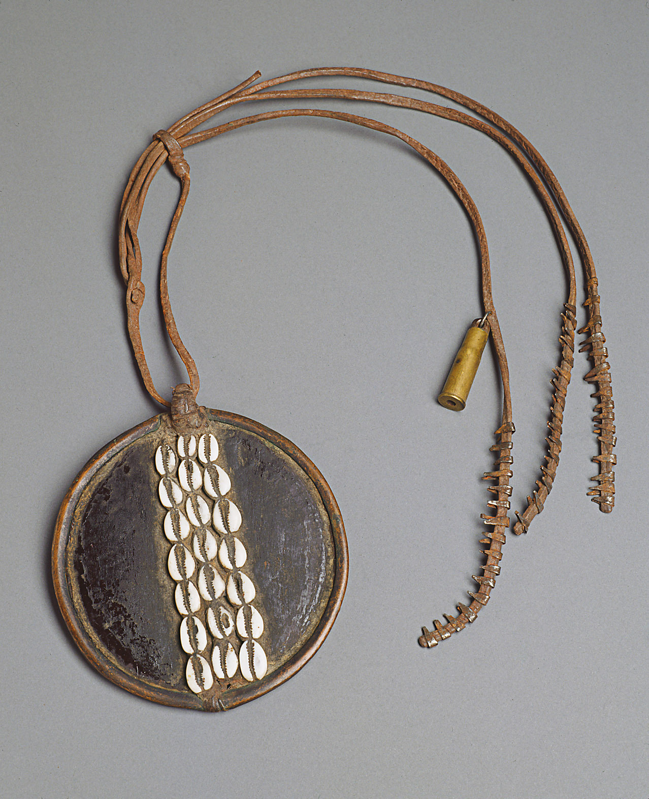 Holz, Kaurischnecken, Leder, Kupfer