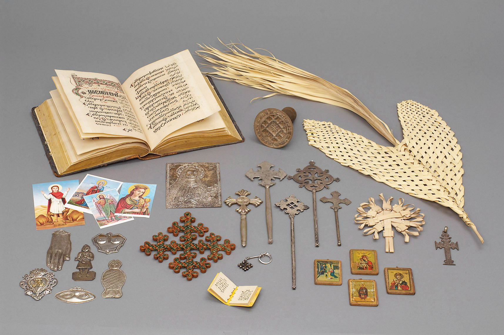 Koptische und griechisch-orthodoxe Religiosa: ein liturgisches Manuskript mit Marginalglossen in Arabisch (datiert 1266 AH, 1849/50 n.u.Z.), Andachtsbilder (die Heilige Barbara, Johannes der Täufer, der Heilige Mina, die Heilige Marina), Miniaturikonen (der Heilige Nikolaos, der Heilige Phanourios, Maria und Jesus, Mariä Verkündigung), aus Palmblatt oder Leder gefertigte Wandkreuze, ein Schlüsselanhänger mit Kreuz, Handkreuze aus Silber, ein Miniaturandachtsbuch mit Mariengebeten, ein Brotstempel aus Holz. eine Votiv-Ikone der Heiligen Teresa von Lisieux aus Silber, Votivbleche aus Silber (weiblicher Torso, Wickelkind, Augenpaar, eine Hand mit arabischer Inschrift, ein Kreuz tragendes Mädchen).