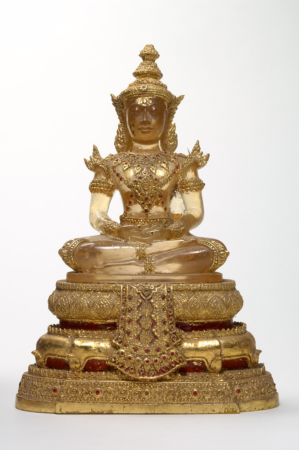 Der Buddha aus transluzidem Polyesther, mit Schlagmetall, roter Acrylfarbe und roten Glassteinintarsien verziert, sitzt mit ineinand gelegten Händen auf einem hohen Thron. Dabei handelt es sich um eine Nachahmung des Prakaew Morakod, "Buddha aus Smaragd Kristall", aus dem Wat Phra Kaeow in Bangkok.