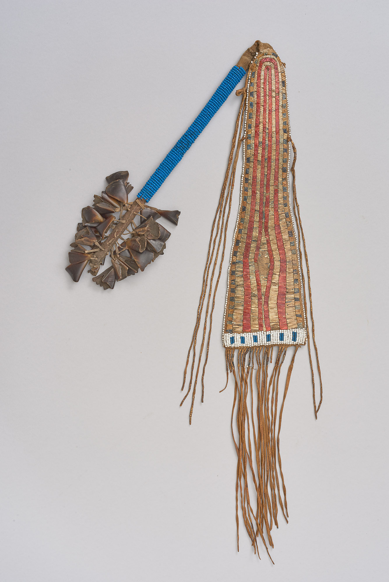 Holz, Hirschzehen (Afterklauen), Leder, Glasperlen, gefärbte Stachelschweinborsten