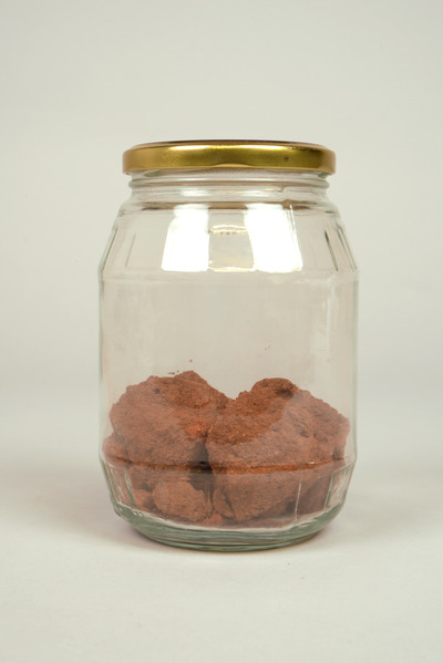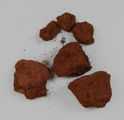 Lateriterde wird zur Produktion des Tonkerns bei der Herstellung von Objekten aus Gelbguss verwendet. Die Materialprobe wurde in der Igun Street erworben, jenem Viertel in Benin City, in dem die Igun Eronmwon (königliche Gilde der Bronzegießer) tätig ist.