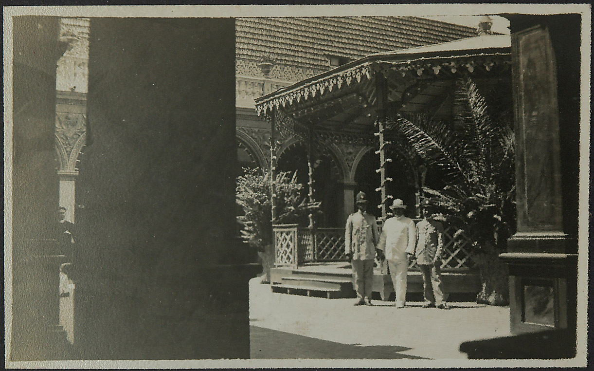 Im Jahre 1888 traf Johann Schild die wichtigste Entscheidung seines Lebens. Er entschloss sich, eine leitende Stellung in der Firma Gebroeders Veth in Padang, Westsumatra anzunehmen und reiste auf dem Schiff Prins van Oranje, das am 1. September 1888 Amsterdam verließ. Hier ist vermutlich das Haus von Konsul Schild in Limau Manis, Padang zu sehen. Konsul Schild steht mit zwei Beamten vor dem Haus, um 1900.