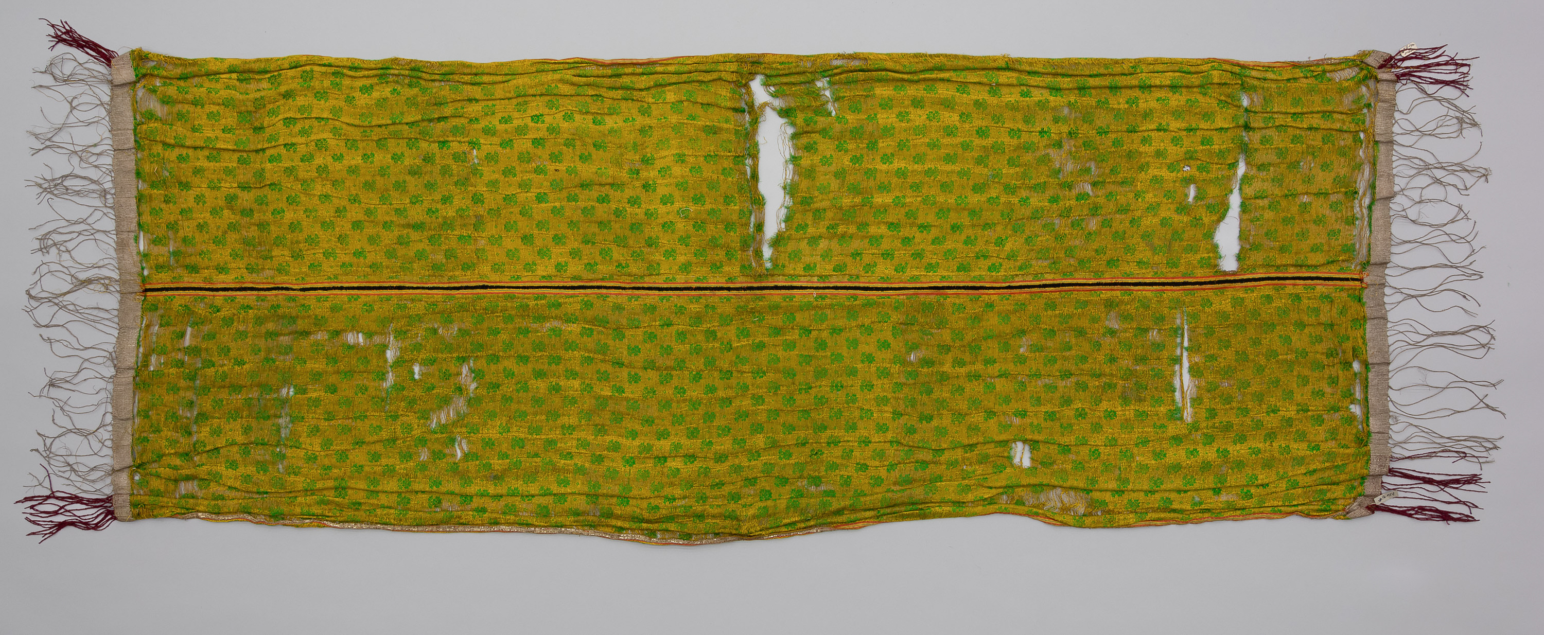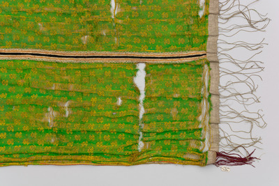 Seide, Satin liseré, Ziernaht, Applikation mit Metallfaden- und Fransenborten