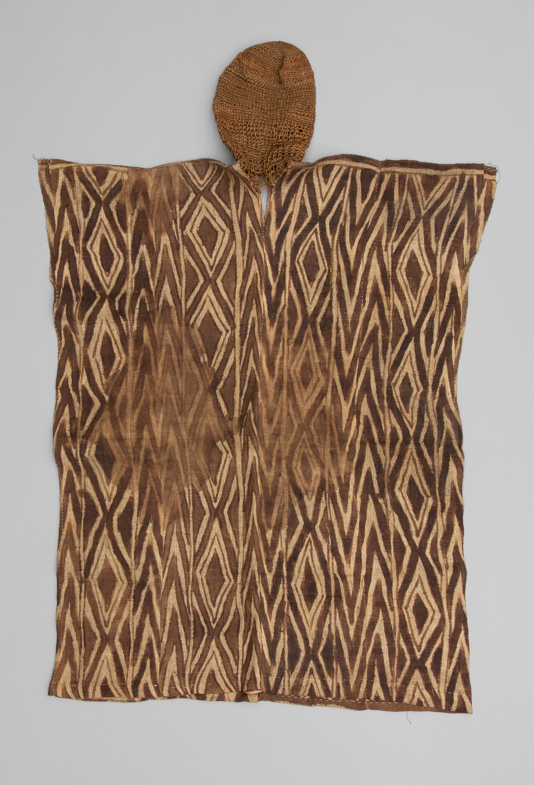 Pflanzenfasern, bemalte Leinwandbindung, Handnähte in Windelstich, Kopfteil Maschenstoff