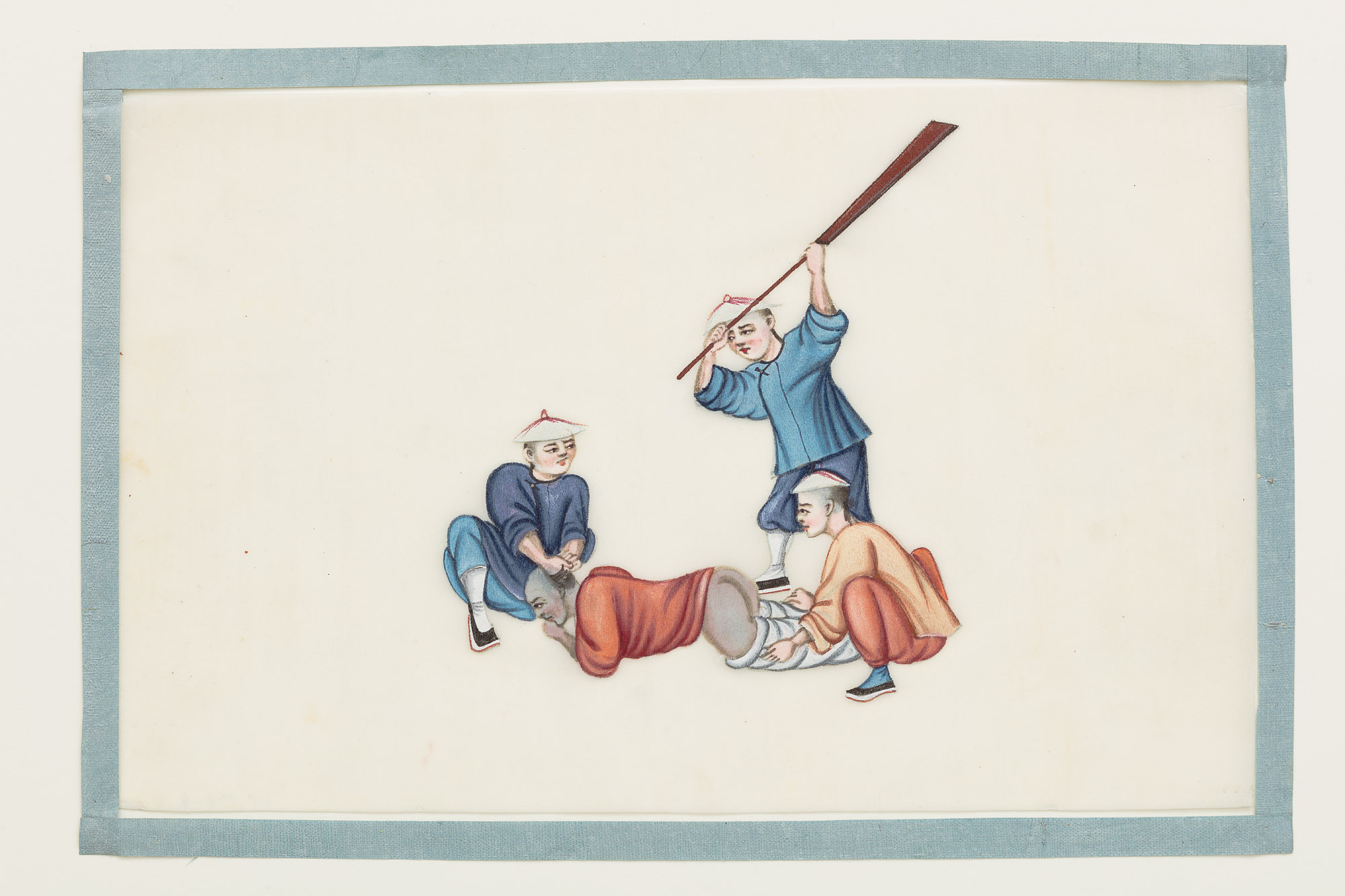 Bei diesen Genrebildern handelt es sich um sogenannte China Trade Art. Sie wurden von chinesischen Werkstätten in Südchina (Raum Kanton) ­für Ausländer angefertigt und dienten in westlichen Publikationen oft der Textillustration. Die ausgestellten Objekte nehmen Bezug zu den Bildern.