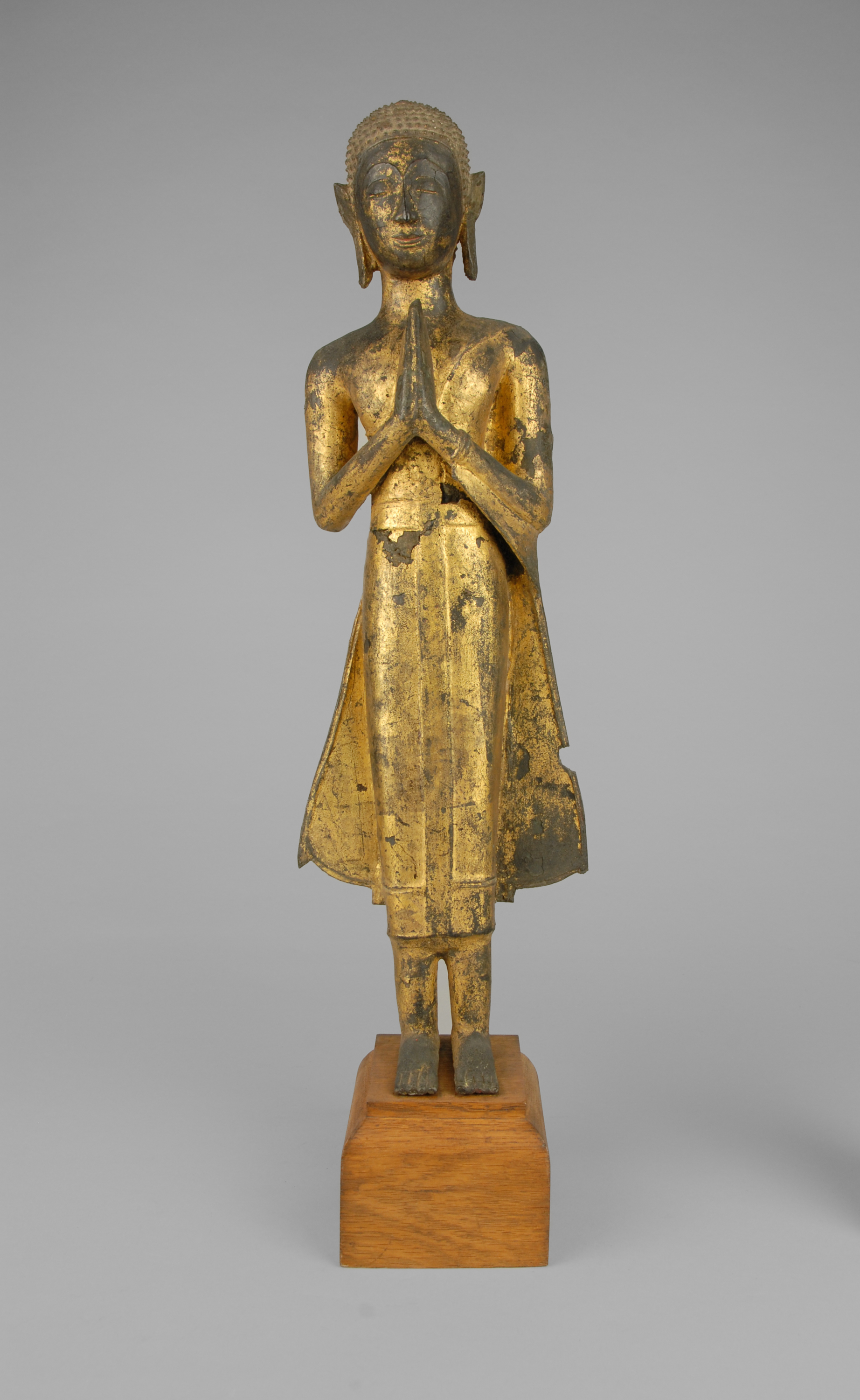Der in einem Mönchsgewand gekleidete Anhänger Buddhas zeigt die anjalimudra, die Geste des Respekts.