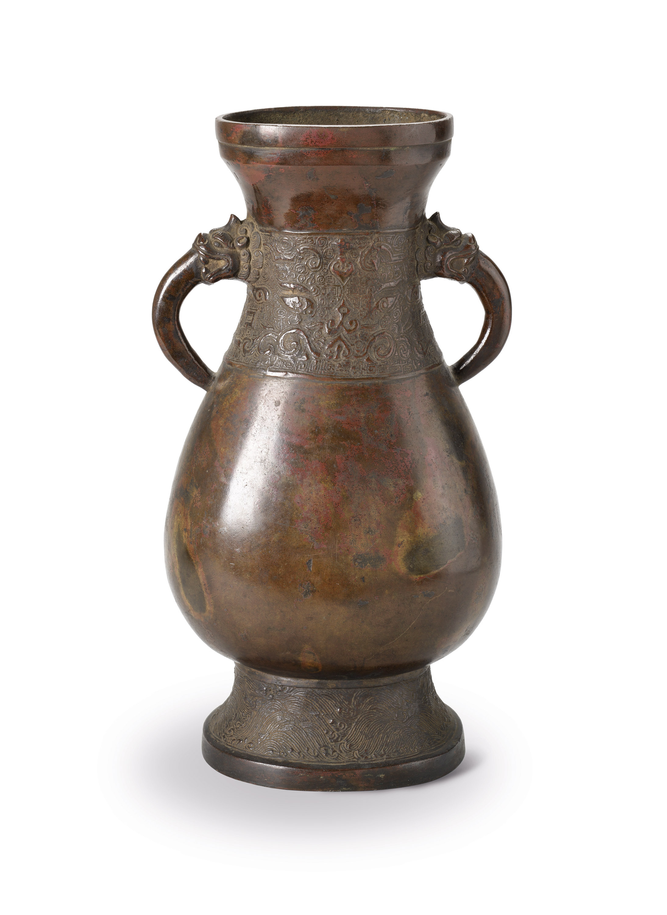 Neben den dekorativen Flachreliefs rund um den Hals und den Henkeln in Gestalt zubeißender Löwen mit prächtiger Mähne zeichnen sich diese beiden Vasen für die Blumensteckkunst des ikebana durch eine rotviolette Färbung der Bronze aus. Bei der linken Vase (Inv.-Nr. 34673) ist die Kontur der stark geweiteten Mündung in Malvenblütenform (aoi mokkō-gata) ausgeführt. In der Mitte des Halses prangt als großflächiges Relief ein Gesicht ähnlich dem eines Wasserbüffels mit langen Hörnern, während darunter die Motive des kui-Drachen und des Drachenvogels kuifeng vom tieferliegenden Donnermuster eingefasst erscheinen. Bei der rechten Vase (Inv.-Nr. 34670) wiederum sind mit Augen, Nase, Stirn und Zähnen einzelne Teile vom Gesicht eines taotie mitten über das Donner- und Spiralmuster um den Hals verstreut, gemahnen in dieser Anordnung jedoch weniger an die Züge eines grausamen Urtiers, sondern vermitteln einen eher sanften Eindruck. Weiters überzeugt die Darstellung der Wellen rings um den Fuß mit elegant fließenden Formen und einer feinen Spatelführung. Ihre Farbgebung verdanken die beiden Vasen einem Herstellungsverfahren, das als hanshidō bekannt ist. Dabei entsteht durch das Erhitzen der Bronze im Holzkohlefeuer ein Oxidationsfilm, der die Oberfläche fleckig erscheinen lässt. Die Herstellung solcher hanshidō-Arbeiten war ab Beginn der Meiji-Periode sehr verbreitet in der Gegend um Niigata, sodass die vorliegenden Objekte mit hoher Wahrscheinlichkeit aus dieser Zeit und Region stammen dürften. (HK)