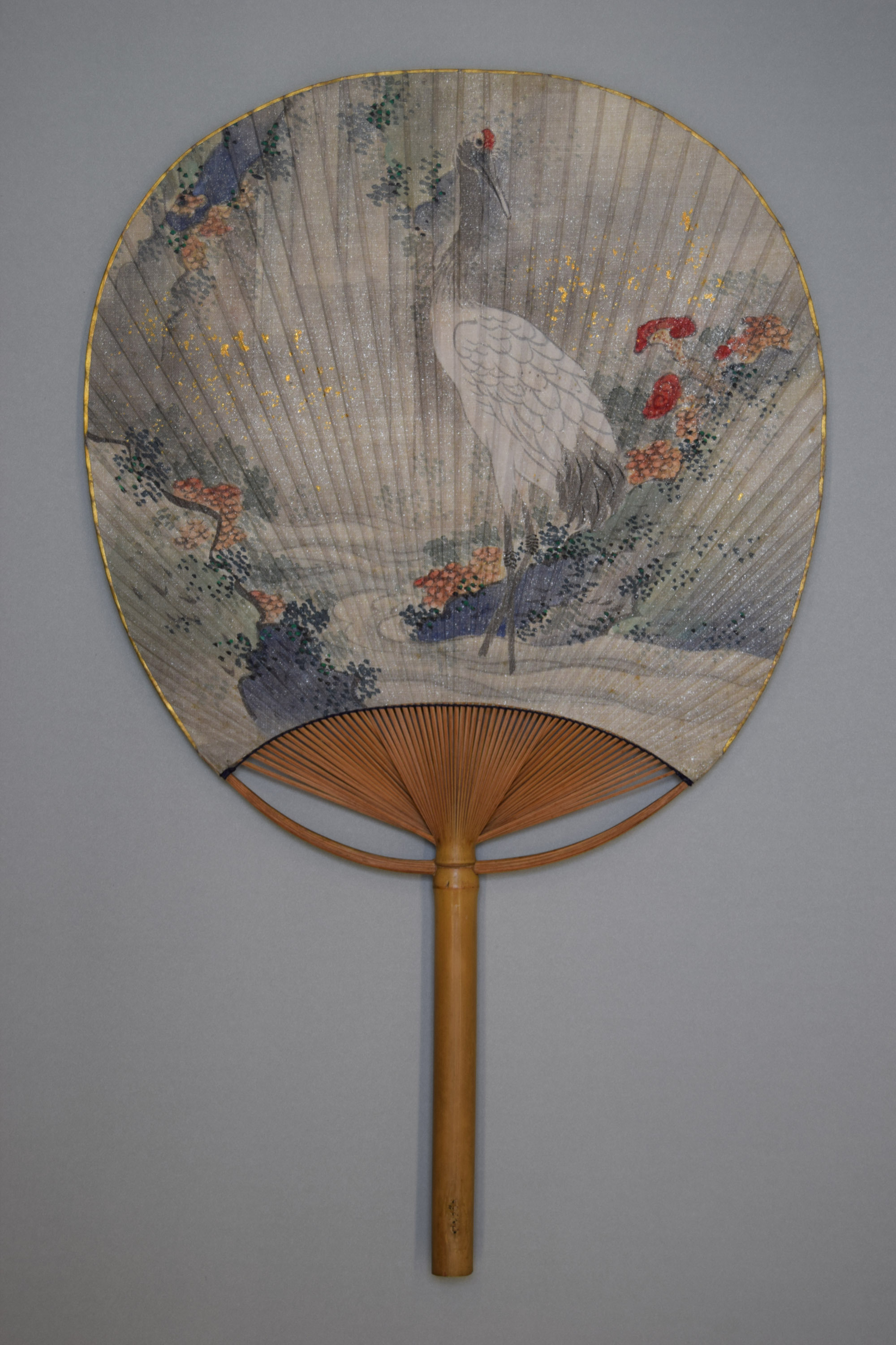 Bambusrohr und Bambusstreifen, Textil, Papier, Aquarellfarben, Glimmer, Goldflitter, vergoldetes Papier (Einfassung Fächerblatt), Schnürchen
