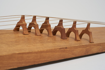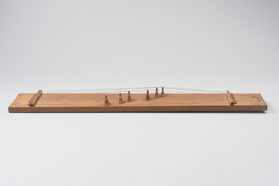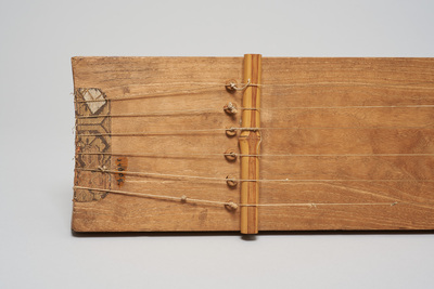 Für dieses Zitherinstrument von schlichter Bauweise wurde ein längliches Holzbrett ausgehöhlt und daraus ein schiffsförmiger Trog gefertigt, der in gestürzter Lage mit sechs Saiten bespannt ist, die an Bug und Heck jeweils über einen Sattel aus Bambus laufen. Sechs bewegliche Stege (kotoji) bilden das Zubehör. Bodenbrett gibt es hier keines, doch an der Unterseite des Hecks ist als Fußteil Bambus befestigt. Auf der Unterseite des Bugs wiederum finden sich in beiden Ecken Zapfenlöcher, in die man Bambus oder zylindrische Holzstücke einfügen und so „Drachenhände“ (ryūshu) genannte Füße befestigen konnte. Als sechssaitige Wölbbrettzither bildet die wagon das älteste Saiteninstrument Japans. Auch dieses Instrument stammt vermutlich davon ab, unterscheidet sich jedoch in Größe und Bauart stark von der heutzutage gebräuchlichen wagon. Ein historisches Beispiel für eine rokugenkin ohne Bodenbrett finden wir in einer Zither mit der Bezeichnung taiheikin von 1834 im Besitz der Nabeshima Hōkōkai Foundation. Interessanterweise sind dem Instrument Fingerplektren (tsume) beigefügt, wie sie sonst zum Spielen der sō verwendet werden. Auf archäologischen Fundstätten ab der Yayoi-Periode hat man vielerorts brettförmige Instrumente ausgegraben, in denen Vorläufer der wagon zu erkennen sind, darunter auch solche ohne Bodenbrett. Möglicherweise reflektiert die Ausführung der vorliegenden rokugenkin das große Interesse an der Wiederbelebung antiker Musikinstrumente Ende der Edo-Periode. (KH)