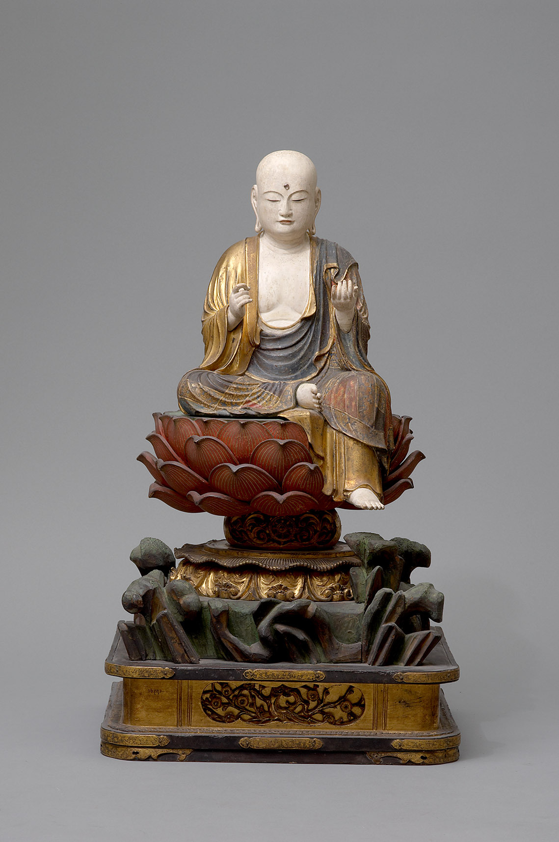 Holz, polychrome Fassung, Goldlack, Glas, Messing