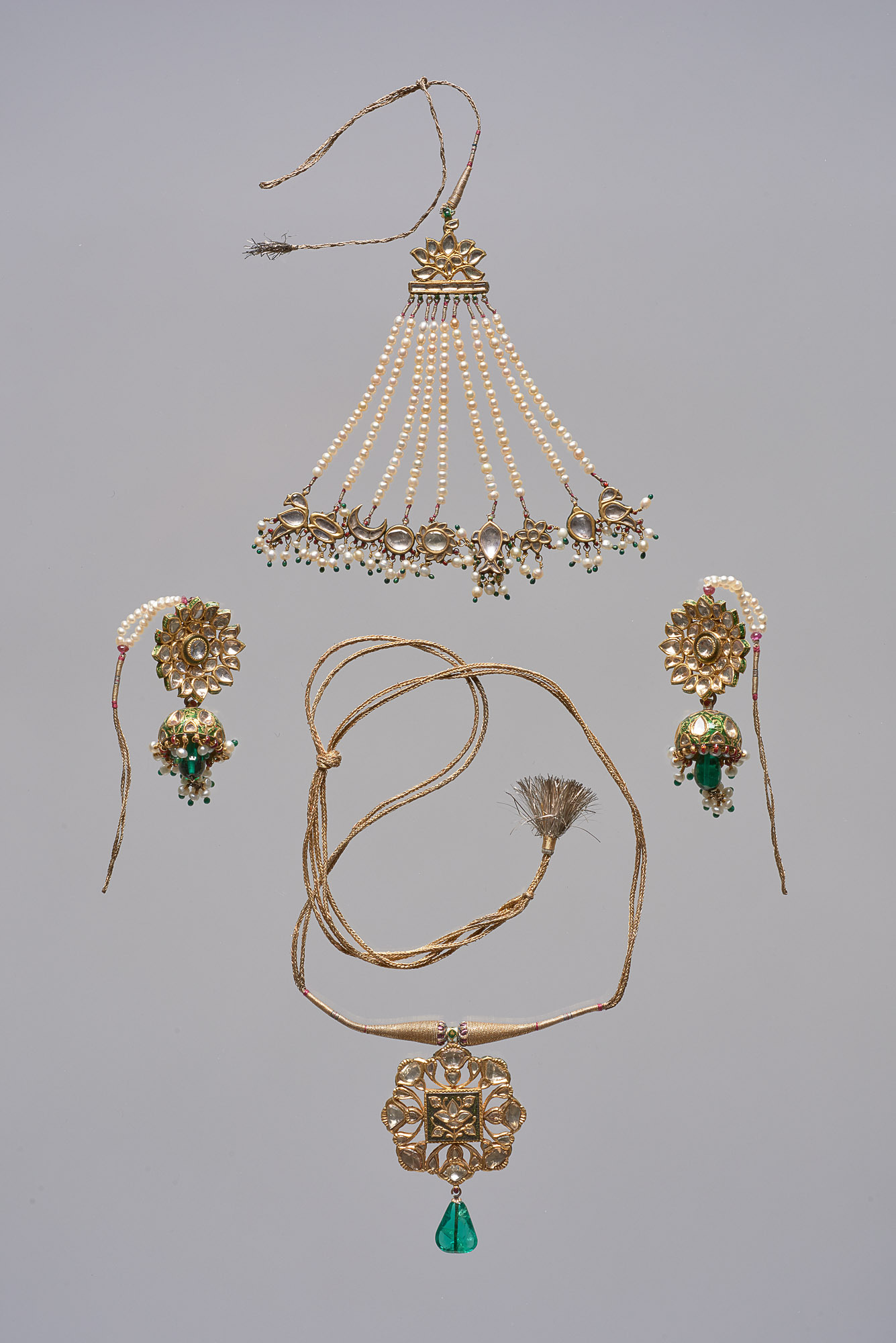 Beim Stirnschmuck im Bild ganz oben sind die Saphire des Blumenbildes sind in Gold gefaßt, das an den Seiten emailliert wurde. An einem gleich gearbeiteten Steg sind 9 Schnüre aus Flußperlen befestigt. An jeder hängt eine kleine Figur aus goldgeaßten Saphiren. Zwischen Papageien baumeln je eine Mango, eine Blumenblüte, ein Fisch, Sonne, Voll-und Halbmond. Den Abschluß bilden wieder Perlen. Der Goldfaden, an dem die durchbohrte Perle aufgefädelt ist, wurde in flüssiges, grünes Glas getaucht. Der bei der Abkühlung gebildete grüne Tropfen hält die Perle fest.