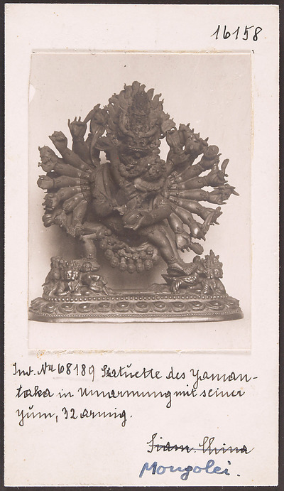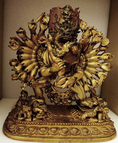 Der Yidam (= allgemeine Bezeichnung für tibetische Schutzgottheiten) Vajrabhairava (der Erschreckende mit dem Vajra) ist eine der komplexesten Gottheiten des lamaistischen Pantheons. Yamantaka repräsentiert die Diamantene Weisheit der höchsten Realität im Triumph über Übel, Leiden und Tod. Hier ist er mit neun Köpfen, vierunddreißig Armen und sechzehn Beinen dargestellt. In tanzender Haltung ist er mit seiner weiblichen Konsortin Vajravetali, die Diamantene Untote (vetali) vereinigt, was die glückselige Union von Mitgefühl und Weisheit symbolisiert.