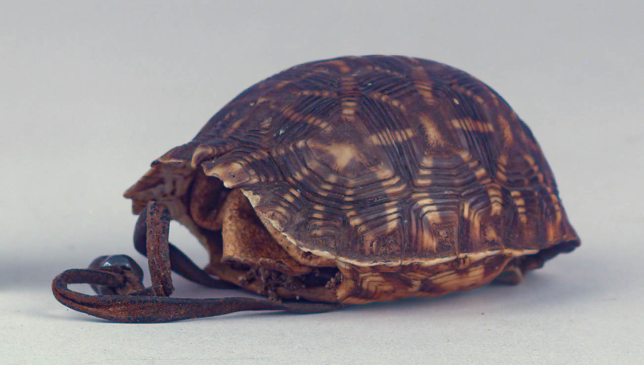 Schildkrötenpanzer (testudo oculifera/ Stachelrand-Landschildkröte), Leder, Eisen