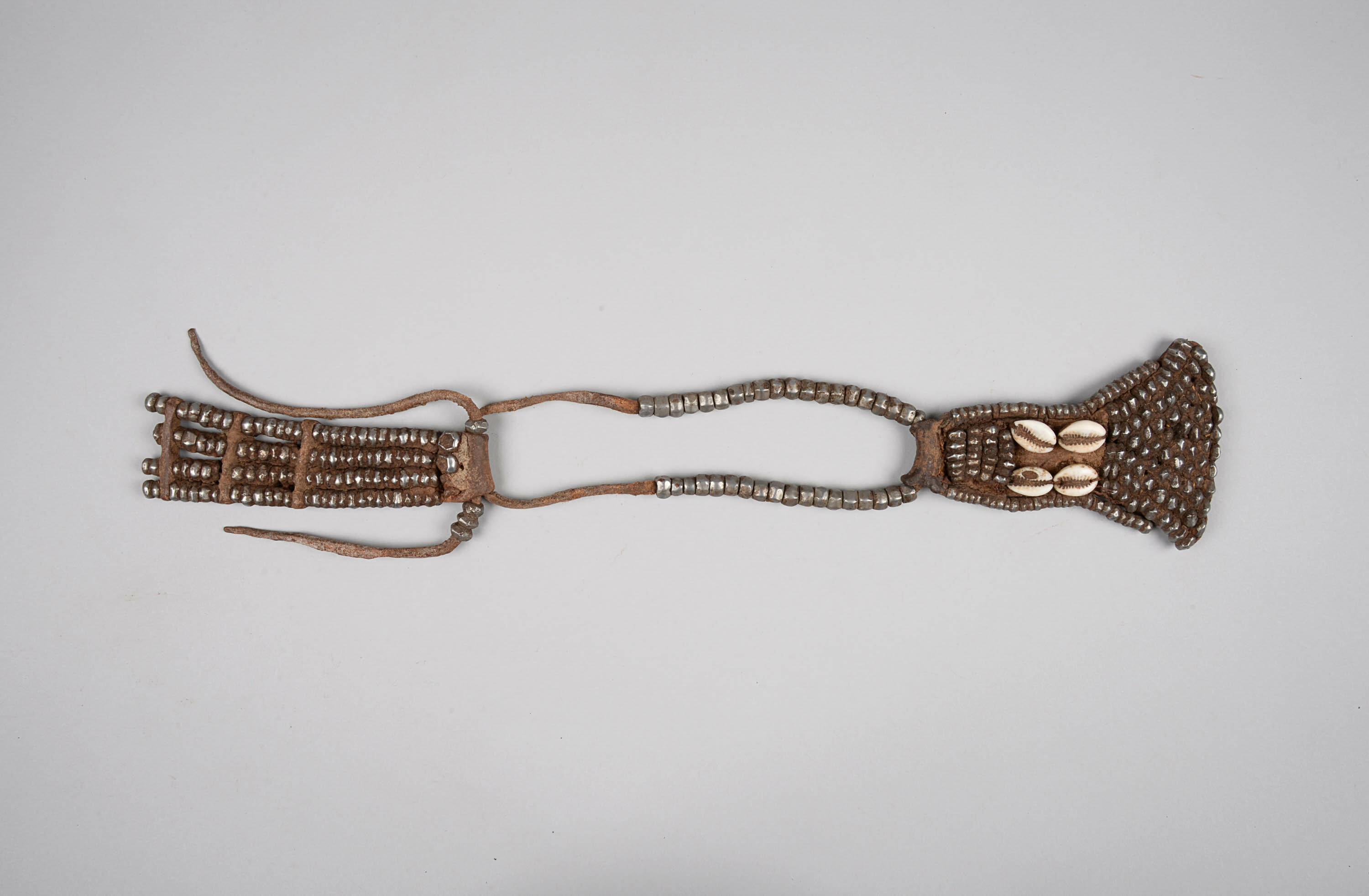 Leder (Rind), mittelgroße u. große Eisenperlen, Kaurischnecken (Cypraea moneta oder Monetaria annulus), Garn (Rindenbast oder Palmblatt), rußschwarze Pflanzenpaste (Fett, Staub), Dung (Rind), Hämatit-Patina (Fett, Staub)