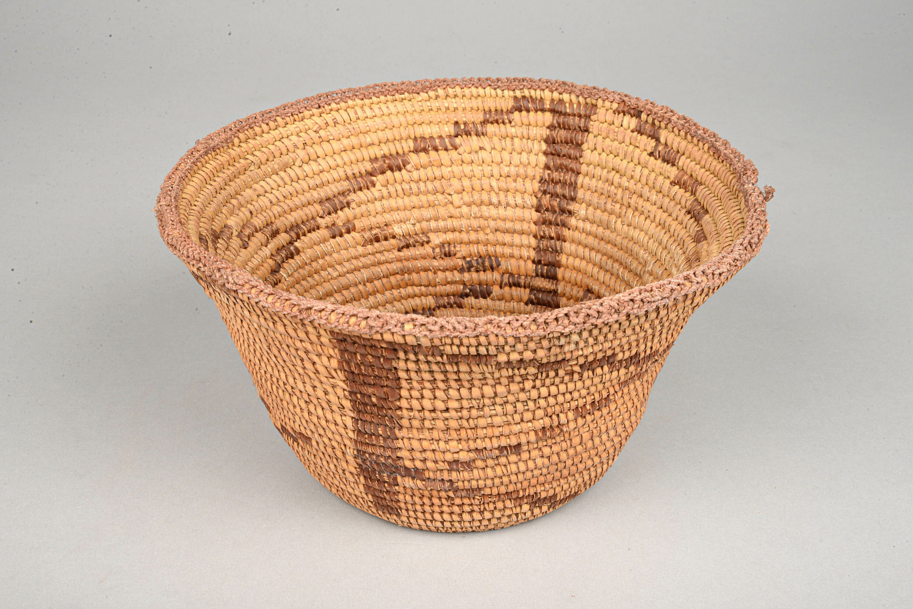Palmblatt (Hyphaene petersiana, früher: ventricosa), Kunststoffkordel (aus Maissackgewebe), Hämatit-Patina (Staub, Fett), Wulsthalbflecht-Technik, Palmblatt-Bräunung durch Einlegen in Wasser