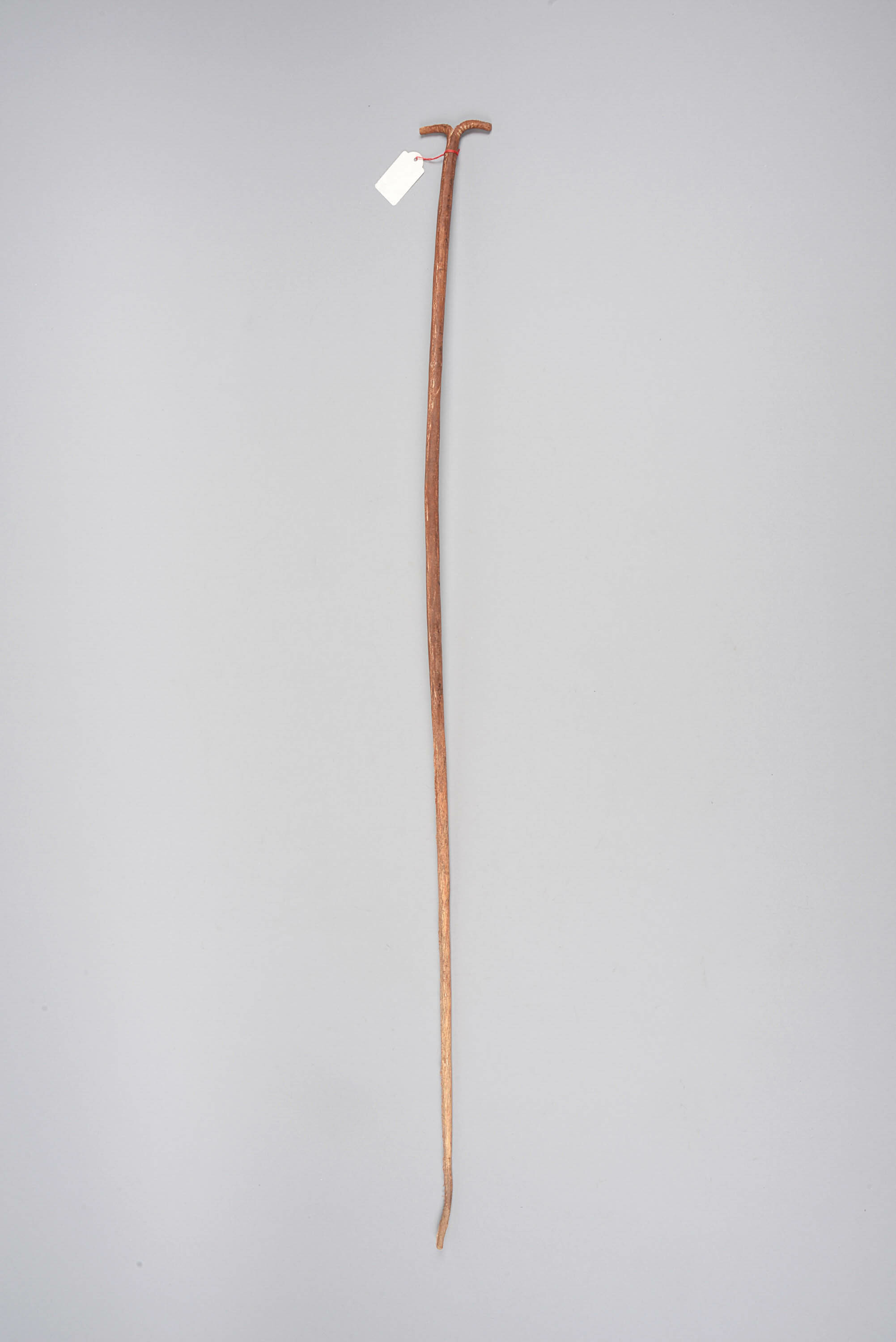 Leder (Rind), Garn vermutlich aus Palmblatt (Hyphaene petersiana) oder Baumrindenbast (evtl. Adansonia digitata, Sterculia africana,Terminalia prunioides oder Acacia reficiens o. tortilis), Hämatit-Patina (Fett, Staub)