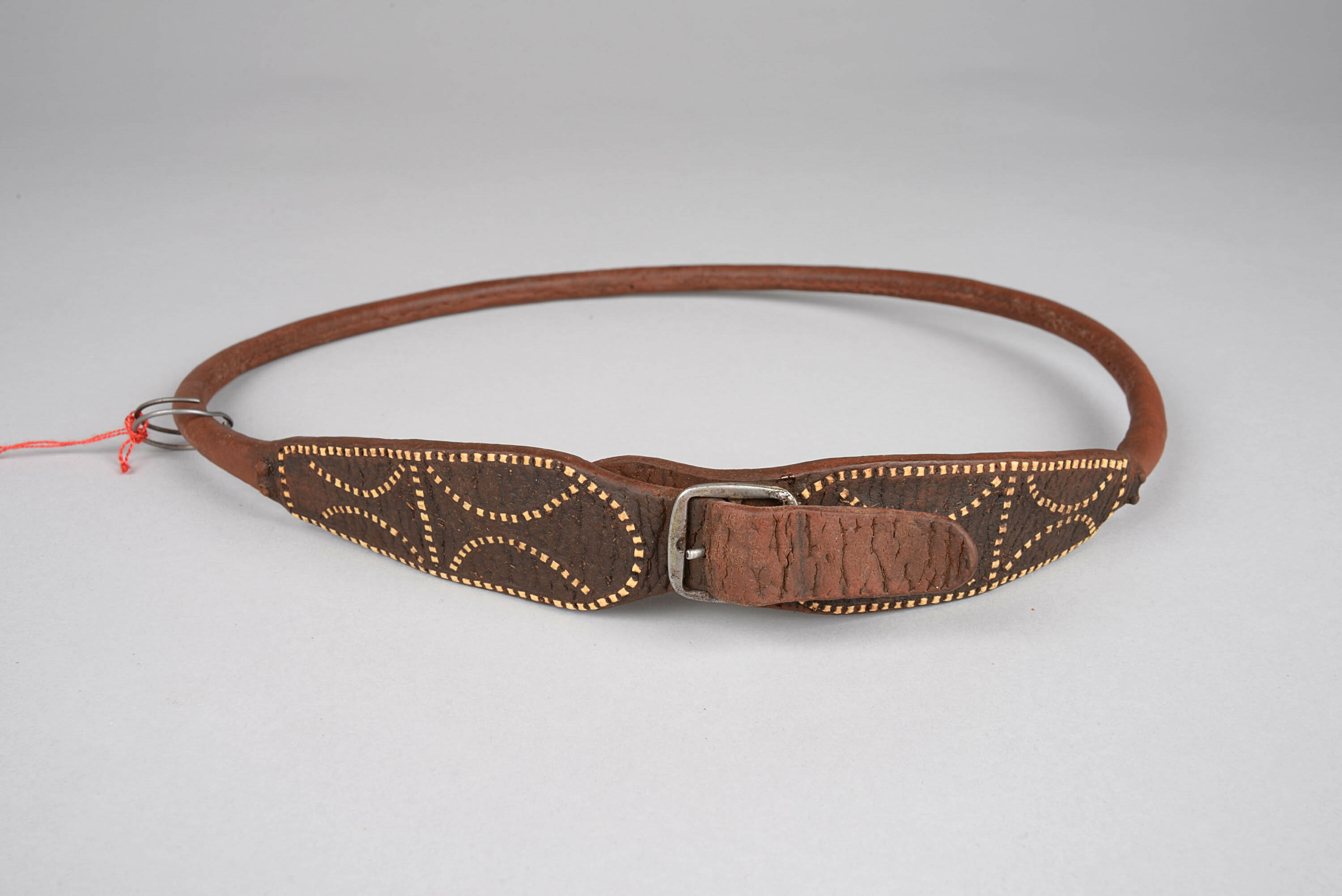 Leder (Rind), Blechschnalle (Aluminium?), dünner Metallring (Schlüsselring), Plastikstreifen (Vaseline-Behälter), Garn aus Palmblatt (Hyphaene petersiana, früher: ventricosa), Hämatit-Patina (Fett, Staub)